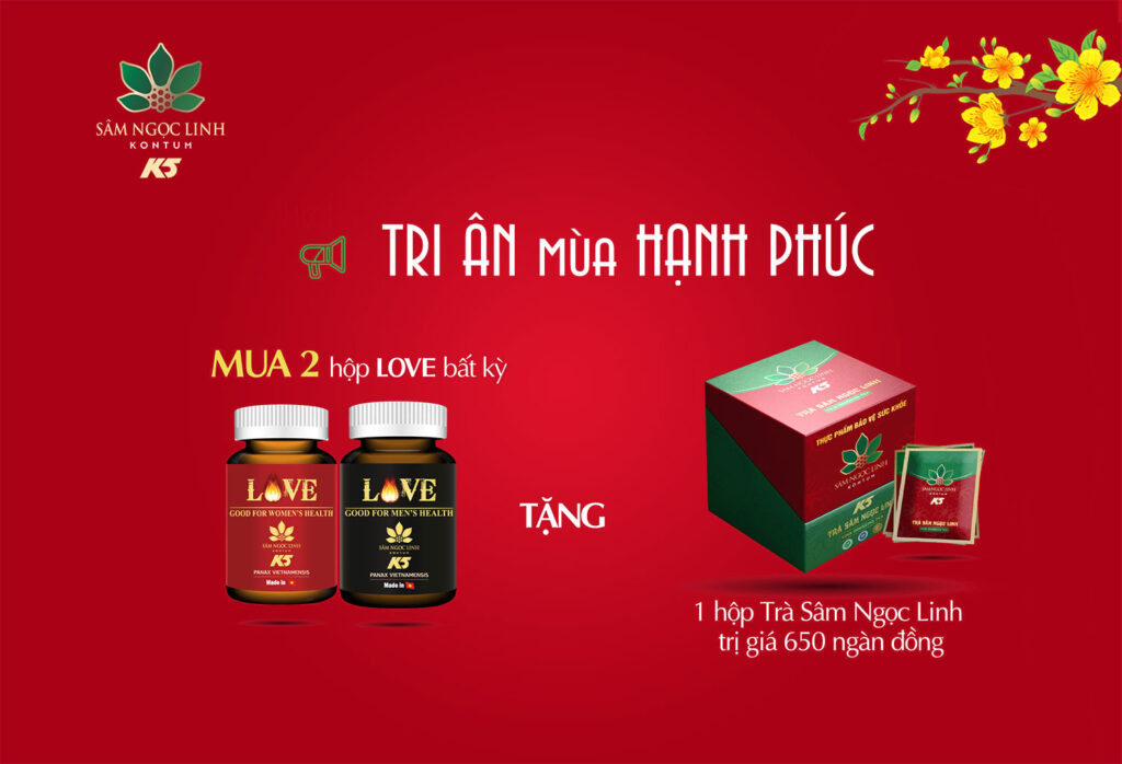 KHUYẾN MÃI xuân HẠNH PHÚC: Mua 2 sản phẩm LOVE bất kỳ TẶNG 1 hộp K5 Trà Sâm Ngọc Linh TRỊ GIÁ 650K.